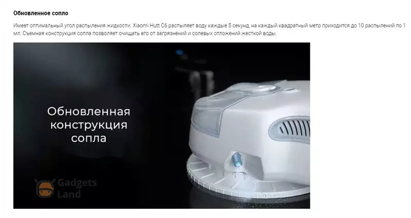 Специалисты Hutt детально проанализировали отзывы покупателей по прошлой модели робота с режимом влажной уборки. Оказалось, что для более качественной очистки требуется разбрызгивать существенно большее количество воды, чем раньше. Соответственно, C6 автоматически распыляет на очищаемую поверхность каждые 5 секунд 1 мл жидкости (у более ранней модели распылялось по 0,2 мл каждые 10 секунд). Также теперь в микропрограмме робота установлено ограничение: на каждый квадратный метр поверхности приходится до 10 распылений.